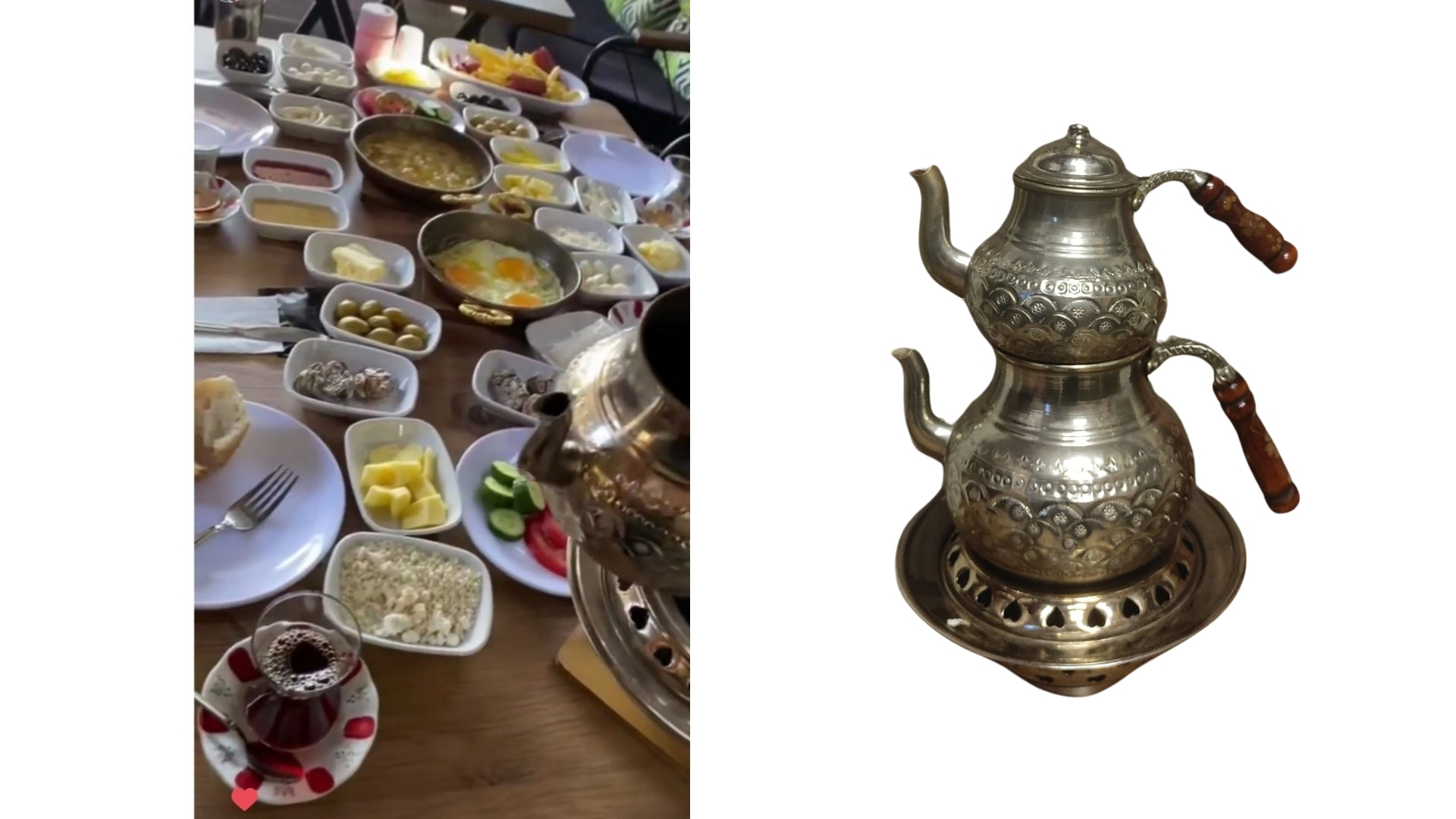 2 kişilik serpme kahvaltı. Siyah zeytin, yeşil zeytin, çökelek peyniri, kaşar peyniri, beyaz peynir, helva, reçel, tereyağı, bal, çikolata, sigara böreği, patates kızartması, sahanda yumurta ya da menemen, salatalık ve domates. Küçük semaver ile servis edilir.